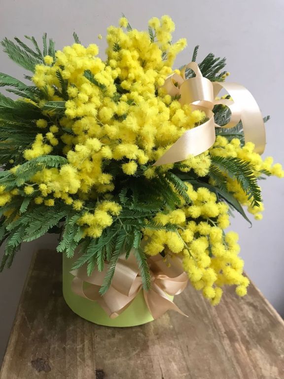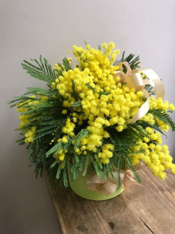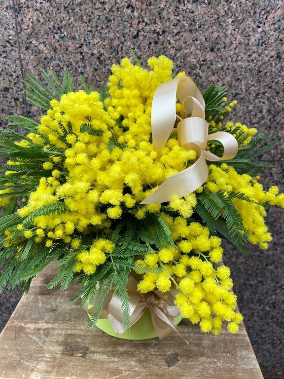 Яркий букет в желтой гамме упакован в бумагу гармонирующего с цветами оттенка.
