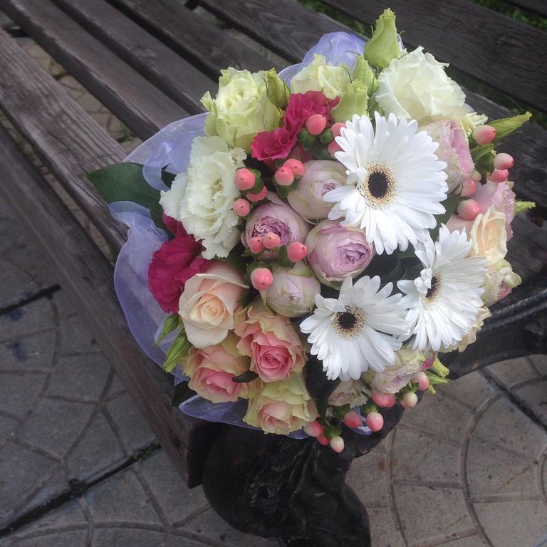 В оставе букета розы трех сортов, герберы, шарики брунии.