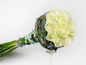 Букет из белых роз с желтовытым оттенком. Декорирован лозой, проволокой с голубыми кристаллами и лепестками голубой гортензии.