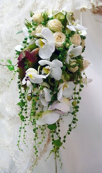 Букет из белых роз, белоснежных орхидей, розовых кал. Декорирован лентами.