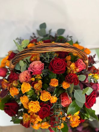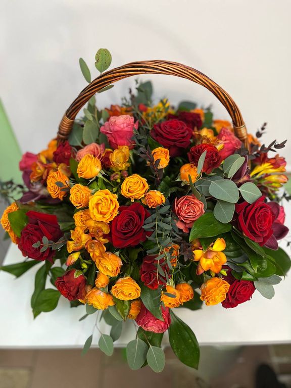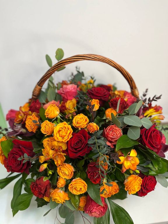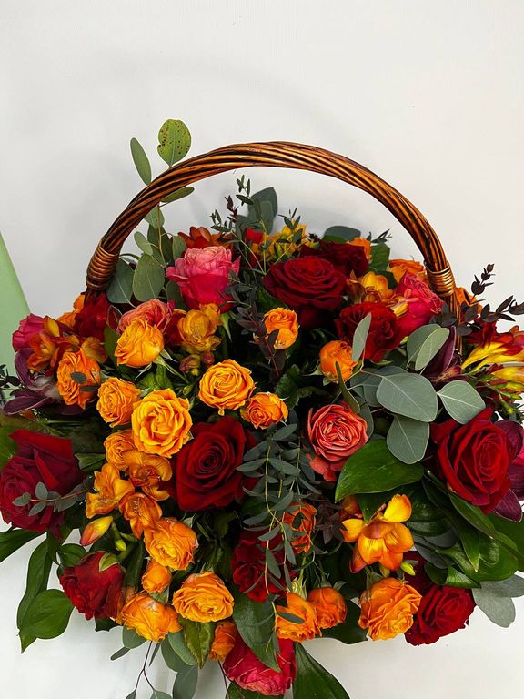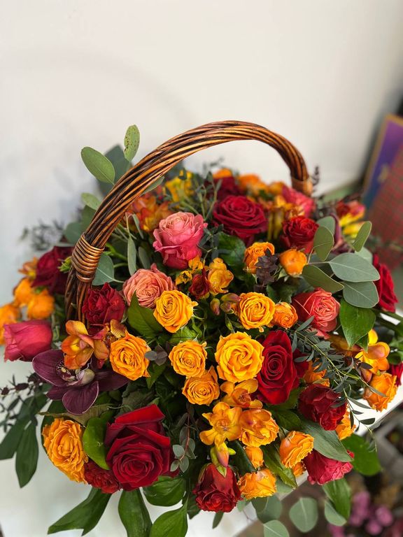 Состав: роза одноголовая, роза кустовая, фрезии, орхидея цимбидиум, эвкалипт, рускус, оазис, корзина